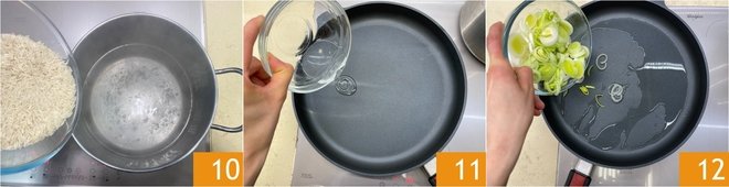 Now bring a pot full of salted water to a boil and cook the rice until al dente 10. In a pan, pour the coconut oil 11, when hot add the leeks 12 and cook for 3 minutes.