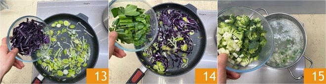 Add the cabbage 13 and sauté everything over medium heat for 5 minutes, then add the chard leaves 14. After the first 5 minutes of cooking the rice, add the broccoli (florets and stems) to the pot 15.