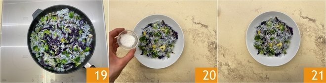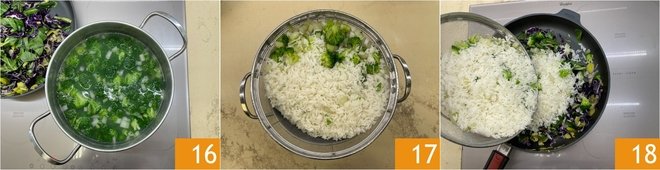 Continue cooking 16 and drain when the rice is al dente 17. Transfer the rice with the broccoli to the pan with the vegetables 18 and sauté everything until the rice is fully cooked.