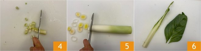 Cut the remaining stem in half and then into cubes 4. Clean the leek: remove the stalk and the green end, then take off the outer leaf, and slice it into rings 5. Clean the Swiss chard: remove the ends and separate the leaves from the stalks 6.