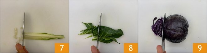 Cut the stalks in half and then into chunks 7. Also, chop the leaves into pieces 8. Finally, clean the purple cabbage: remove the end and cut it in half, then slice it into julienne 9.