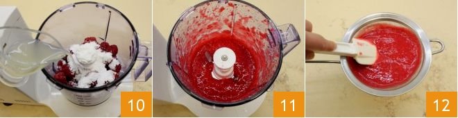 Add the lemon juice 10 and then blend everything 11. Strain the coulis you have obtained through a fine-mesh sieve, helping yourself with a spatula 12 and then set aside.