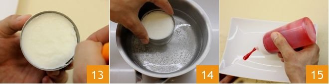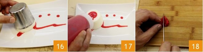After 3 hours, when the panna cotta is firm, insert the blade of a knife halfway into the mold and run it around the perimeter to detach the panna cotta from the edges 13. Then, immerse each mold for a few seconds in boiling water, stopping 2-3 mm from the edge 14. After completing this step, decorate the serving plate with the raspberry coulis to create the base on which you will place the panna cotta, using a dispenser 15 or a piping bag.