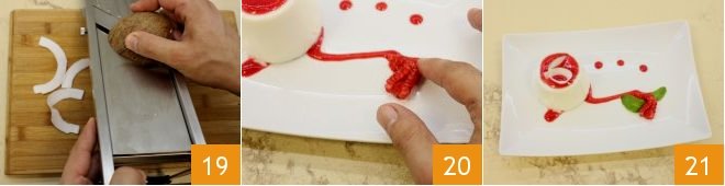 thinly slice the coconut with a mandoline 19 and complete the decoration with a raspberry 20, a couple of mint leaves, and the coconut slices 21; once finished, serve the coconut panna cotta with raspberry coulis immediately.