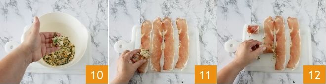 to cover them completely 10. Lay the slices of speck on a cutting board and place each bite at the beginning of one of the slices 11. Roll up to get a roll 12.