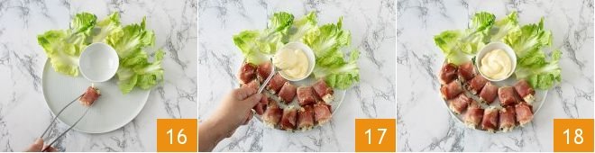 Arrange some lettuce leaves and a small bowl on a plate, then transfer the bites as well 16 and fill the small bowl with mayonnaise 17. Your cod and speck bites are ready to serve 18!