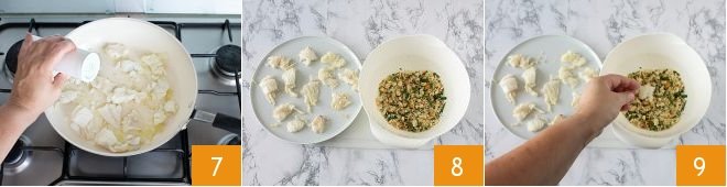 Finally, salt 7 and transfer to a plate 8. Then coat the cod cubes in the breading 9
