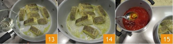 Carefully flour the cod chunks 10, then heat a drizzle of oil in a pan and place the cod 11 browning it on both sides for a few moments, gently turning it, salt 12, and pepper.