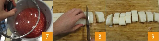 Cover with the lid 7 and cook over medium heat for about 15 minutes. Meanwhile, start cutting the desalted cod into chunks 8, trying to obtain pieces of the same size 9 (if you bought salted cod, you can desalinate it by following our instructions in the guide: How to Desalt Cod).