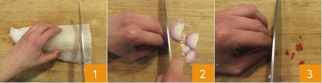 To make cod with chickpeas, start by preparing all the ingredients you will need for the recipe: divide the cod (we used cod that was already desalted) into 6 pieces of equal thickness 1, clean and thinly slice the onion 2, then chop the fresh chili pepper 3,