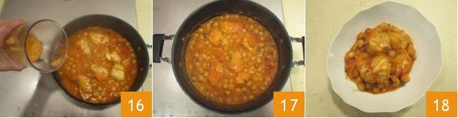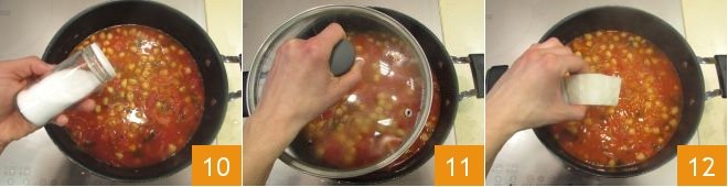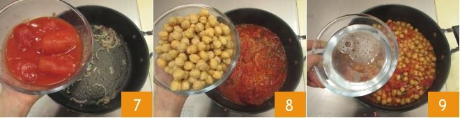 Now add the peeled tomatoes 7 and the pre-cooked chickpeas drained from their preserving liquid 8, extend the sauce with water 9