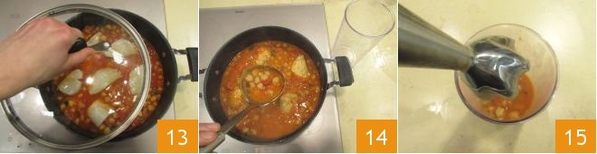 close the lid again 13 and cook for another 10 minutes over medium heat. At this point, take about 6.3 oz of the sauce and transfer it to a tall, narrow container 14, then blend with an immersion blender 15