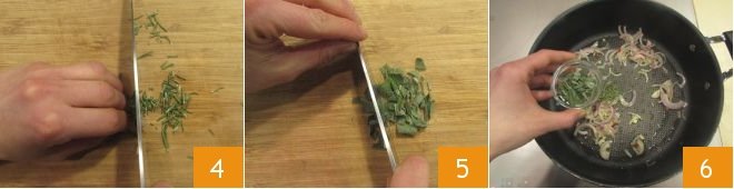 the rosemary needles 4 and sage leaves 5. Heat a drizzle of oil in a large saucepan, add the onion, chili pepper, rosemary, and sage 6 and sauté for a couple of minutes.