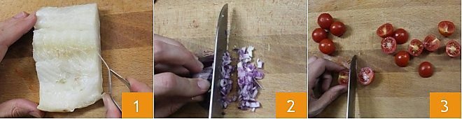 To prepare cod with raisins and pine nuts, start by removing the bones from the cod 1. We used pre-soaked cod ready to consume, but if you prefer, you can use salted cod or dried stockfish, making sure to soak them in cold water for a couple of days, changing the water at least 3 times a day to remove the salt (in the case of salted cod) and to rehydrate (in the case of dried stockfish). Finely chop the red onion with a knife or use a food processor if you prefer 2. Wash and cut the cherry tomatoes in half 3 and place them in a bowl. Slice the olives and set them aside.