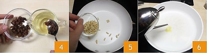 Soak the raisins in 100 ml (3.4 oz) of white wine 4, let the raisins rehydrate for at least 30 minutes, drain them and set aside both the raisins and the now aromatic wine. Place a pan on the stove and toast the pine nuts 5, stirring frequently to prevent them from burning. Heat two tablespoons of oil 6 and