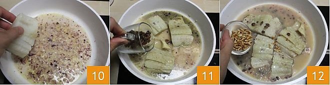 Place the pieces of cod in the pan 10, salt and pepper. After about five minutes of browning, add a glass of wine and let it evaporate by increasing the heat. Add the raisins 11. Once the wine has evaporated, lower the heat. Add the toasted pine nuts 12,