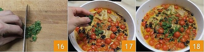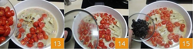 the cherry tomatoes 13 and cover with a lid 14. Do not stir the cod during cooking, just move the pan to prevent it from falling apart. Finally, add the black olives 15 and continue cooking until the sauce reduces and the cod is well cooked, about 20-25 minutes.