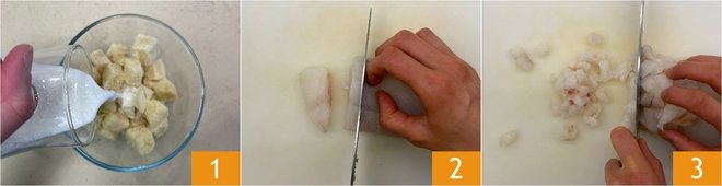 To prepare the codfish meatballs in sauce, first put the breadcrumbs in a bowl, pour in the milk 1, and let it soak for about 20 minutes. In the meantime, remove the skin from the cod fillet and cut it into slices 2, then finely chop it with a knife 3.