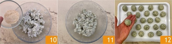If the mixture is too soft, you can add a bit of breadcrumbs 10. You should obtain a homogeneous mixture 11. Form balls the size of a walnut, using wet hands to help you 12; you will get about 25.