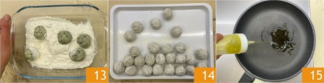 Roll the balls in flour 13 and remove the excess, then place them one by one on a tray 14. Pour a little oil into a large pan 15 and heat it.