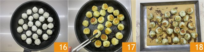 Place the meatballs in the hot pan 16 and fry over moderate heat, turning them on both sides 17. Once golden, transfer them to kitchen paper 18.