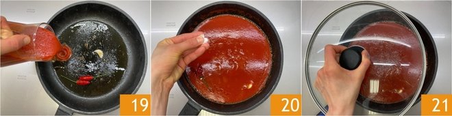 In the same pan, flavor another dash of oil with the crushed garlic clove and chili pepper, then pour in the tomato sauce 19, salt 20, and pepper. Cover and cook over low heat for about ten minutes 21.