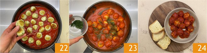 After this time, add the meatballs again 22, gently shake the pan to cover them with the sauce, and continue cooking for another 15 minutes, still over moderate heat with the lid on. If necessary, you can add a drop of hot water. At the end of cooking, sprinkle with chopped parsley 23. Your codfish meatballs in sauce are ready to be served accompanied by some slices of bread 24!