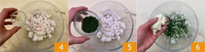 Transfer the cod to a bowl and add the minced garlic 4, chopped parsley 5, and well-squeezed breadcrumbs 6.