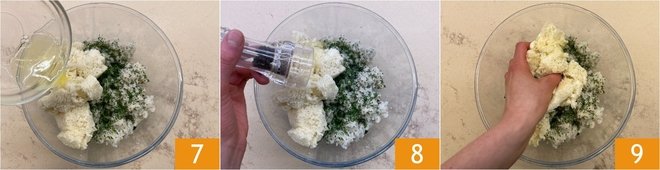 Add the egg white 7, salt, and pepper 8. Mix with your hands to combine everything 9.