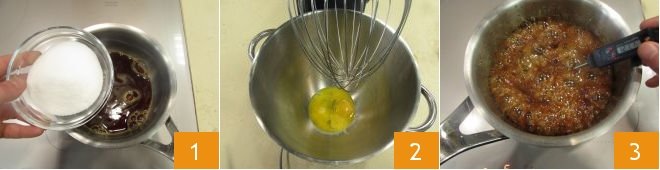 To prepare the coffee parfait, first pour the coffee into a saucepan, add the sugar 1, stir it, and bring it to a boil, keeping an eye on the temperature. Meanwhile, transfer the yolks into the bowl of a stand mixer 2 and start it at low speed only when the coffee syrup has almost reached a temperature of 250°F 3. As soon as the syrup is at the right temperature (250°F) and the yolks are frothy