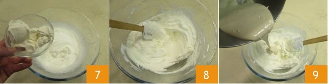 Then add the mascarpone 7 and mix with a spatula, using upward motions from the bottom to the top 8 to avoid deflating it. Then add the coffee mixture 9;