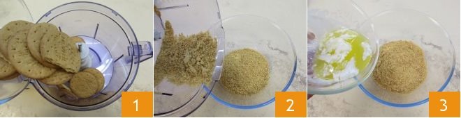To prepare the cold apricot cake, start with the base of the cake. Melt the butter and let it cool. Blend the dry biscuits in a mixer 1 until finely crumbled 2. Then, transfer them to a bowl where you'll add the butter 3 little by little,