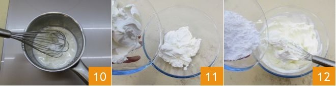 Dissolve the gelatin completely, helping with a hand whisk 10. Let it cool slightly and, in the meantime, proceed with the preparation of the yogurt and mascarpone cream. In a large bowl, combine the yogurt and mascarpone 11. Mix the ingredients with the whisk and gradually incorporate the powdered sugar 12.