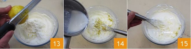 Grate the zest of an untreated lemon 13 and add the now-cooled milk and gelatin mixture 14. Mix to combine the ingredients evenly 15.