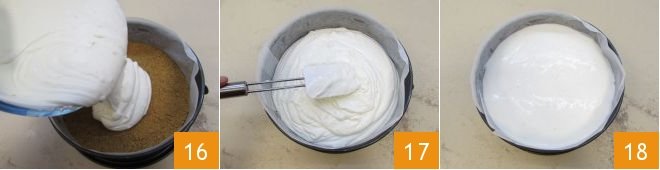 Then, remove the mold from the refrigerator and pour in the yogurt and mascarpone cream 16. Level it with a spatula 17 and refrigerate to set for at least 4 hours 18.