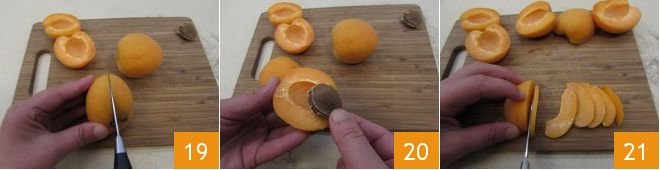 Now, focus on the decoration. Rinse the apricots, dry them, and cut them in half 19. Remove the pit 20 and cut each half into thin slices 21.