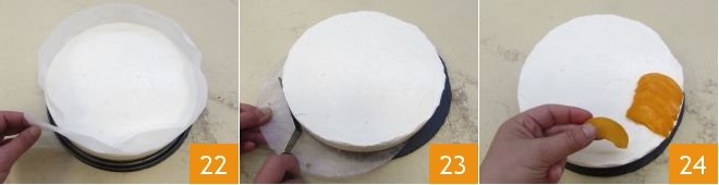 After 2 hours, take the cake out of the fridge, checking that the cream has set, and unmold it. Gently remove the ring of the springform pan and peel off the parchment paper from the edges of the cake 22. To remove the parchment from the bottom, use two flat and long spatulas to slide between the bottom and the paper itself and transfer the cake to a serving plate. Optionally, smooth the side edges of the cake 23. Then, start arranging the apricot slices 24.