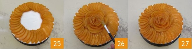 Arrange them to create a radial design starting from the edges of the cake 25 until covering its inner part as well. You can arrange the apricots in a rose pattern in the center. Finally, take the apricot jam and, using a brush, evenly coat the surface of the cake 26, covering any gaps between the fruit. Now, the dessert is ready, and all you have to do is enjoy your cold apricot cake 27!