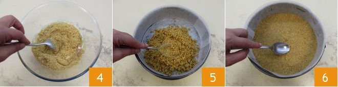 while mixing the ingredients with a spoon to combine them and obtain a sandy mixture 4. Then take a 9.5-inch springform pan, butter it, and How to line a cake tin with parchment paper. Pour the mixture of biscuits and butter into it 5 and level it to evenly cover the entire base, helping yourself with the back of a spoon 6. Refrigerate to firm up for at least 30 minutes.