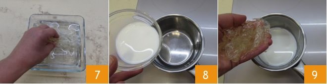 In the meantime, prepare the cream. Soak the gelatin sheets in a bowl of cold water 7. Let them soften for at least 10 minutes. Then take a saucepan where you'll pour the milk 8. Bring it to just below boiling and turn off the heat. Then take the soaked gelatin, drain it, squeeze it well, and add it to the milk 9.