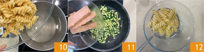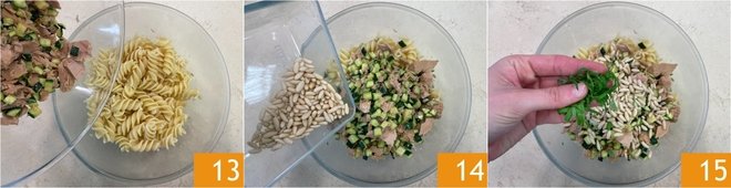 Cook the fusilloni in the same water used for the zucchini 10. Meanwhile, add the drained tuna to the zucchini 11 and break it into pieces with the spoon, then pour in a little pasta cooking water and stir to combine and flavor. Turn off the heat and let the seasoning cool. Drain the pasta into a bowl 12 and let it cool as well.