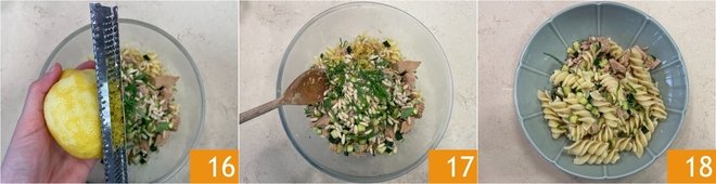 Finally, flavor with grated lemon zest 16. Mix everything well 17 and serve your cold pasta with tuna and zucchini, garnishing as desired with more lemon zest 18!