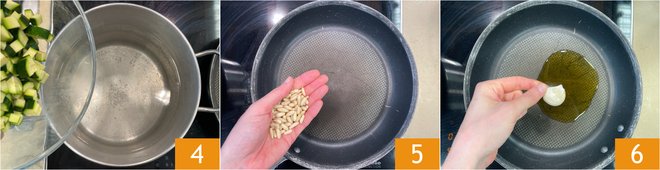 Blanch the zucchini in salted boiling water 4 for 2 minutes. In the meantime, toast the pine nuts in a non-stick pan 5. In another pan, flavor the oil with the garlic clove 6.