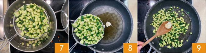 Drain the zucchini 7 and transfer them to the pan with oil and garlic 8, then sauté them over medium heat for 15 minutes 9.