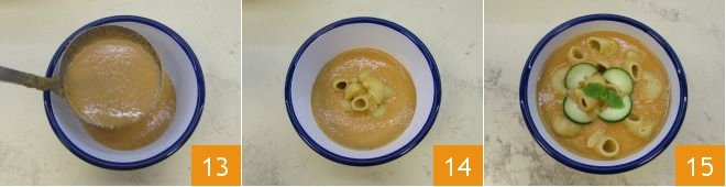 Divide the remaining gazpacho into the serving plates 13 and pour the dressed pipe rigate into them 14; you can decorate each plate with cucumber slices and basil if you prefer. Your cold pasta with gazpacho is ready to be served.