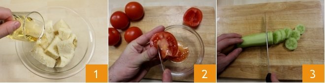 To prepare the cold pasta with gazpacho, start with the latter: extract the crumbs from the stale bread to place in a bowl and moisten with water and white wine vinegar 1; let it absorb the liquids, then drain it with a sieve and set aside. Then proceed to clean and chop the vegetables: wash and cut the tomatoes in half, place them on a small bowl to remove the internal seeds 2; trim and peel the cucumber and cut it into slices 3.