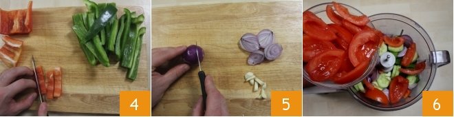 Continue with the green and red peppers: wash them and cut them in half, then remove the stem and internal filament with seeds, then cut the slices into strips 4. Finally, peel the red onion and the garlic clove and slice them roughly 5. Pour the chopped vegetables into a blender 6, add the extra virgin olive oil in a thin stream, also adjusting with salt and pepper to taste.