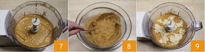 and run the blender to get a smooth and homogeneous mixture 7. Strain the dense mixture obtained using a fine mesh sieve and the back of a spoon to remove any residues of skins and seeds, collecting the mixture in a bowl 8. Transfer the mixture back into the blender and add the well-squeezed crumbs 9 and adjust if needed with salt, pepper, or vinegar.