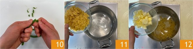 Wash and trim the green beans 10. When the water boils, add the pasta 11 and diced potatoes 12.