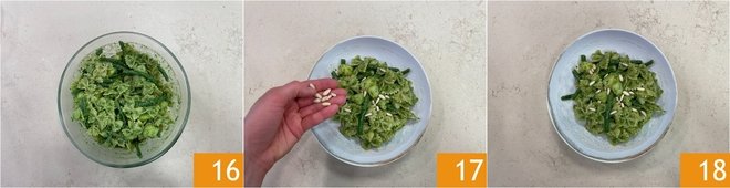 Add the cleaned green beans 13 and boil everything together for the cooking time of the pasta. Drain and let cool 14, then transfer to a bowl and dress with the homemade pesto 15.